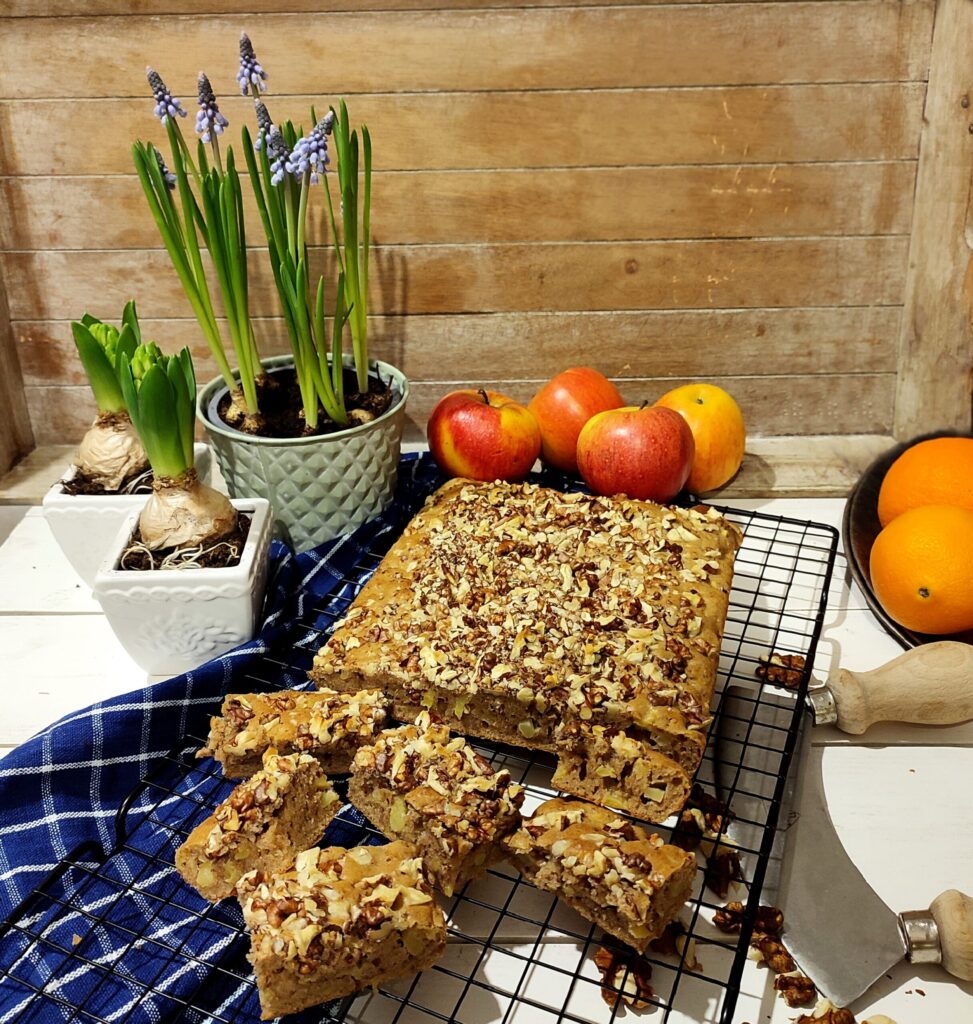- Tegyük bele a száraz hozzávalókat, lisztet, cukrot, sütőport, szódabikarbónát és a fahéjat. Keverjük egynemű tésztává és mehet is a kibélelt tepsibe. A tetejét szórjuk meg a durvára vágott dióval.