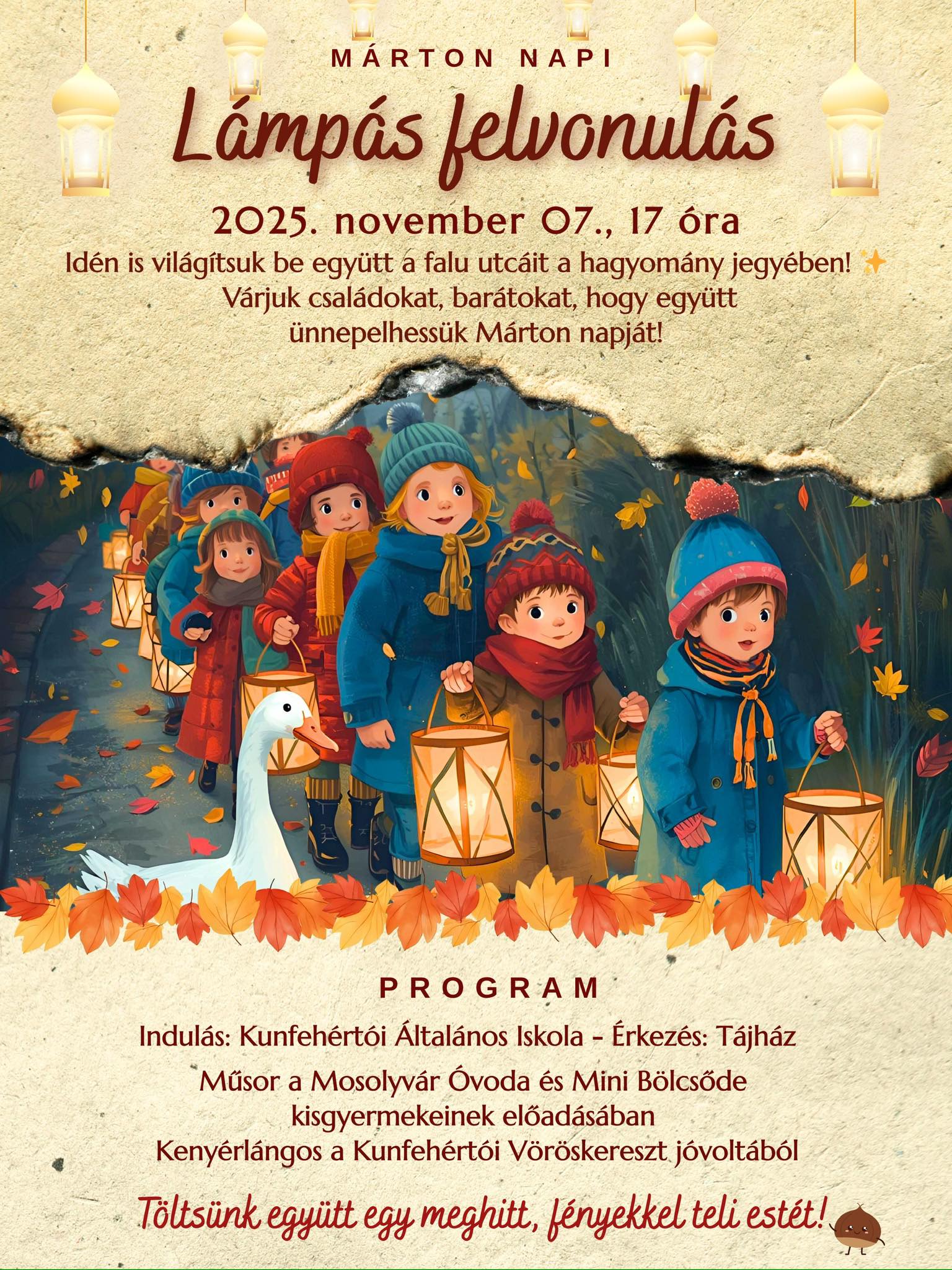 A menet a Kunfehértói Általános Iskolától indul, és a Tájházhoz érkezik, miközben a résztvevők lámpásaikkal világítják be a falu utcáit. A fények sora nemcsak a sötétedő novemberi estébe visz melegséget, hanem szimbolikusan is összeköti a közösséget, hiszen Márton napjának üzenete a jóság, az egymás felé fordulás és a közös öröm megélése.