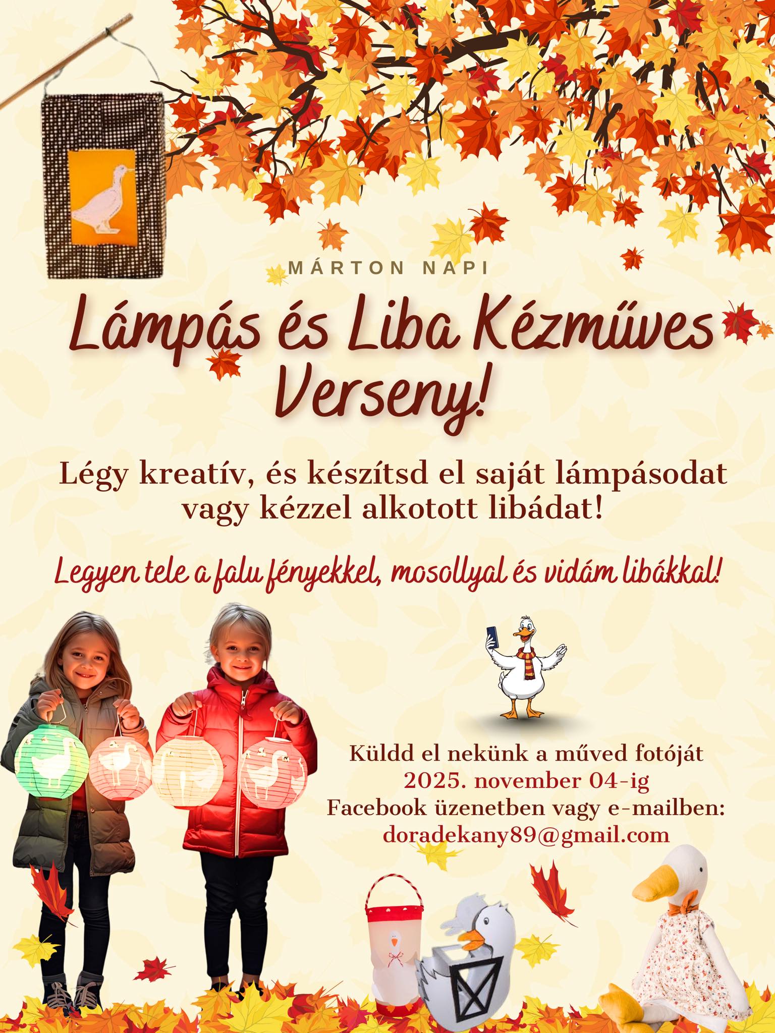 A „Lámpás és Liba Kézműves Verseny” keretében bárki megmutathatja alkotókedvét – legyen szó egy saját készítésű lámpásról vagy egy vidám, kézzel alkotott libáról. A beküldött fotókat 2025. november 4-ig lehet eljuttatni Facebook-üzenetben vagy e-mailben (doradekany89@gmail.com). A legszebb, legötletesebb alkotások meglepetésben részesülnek!
