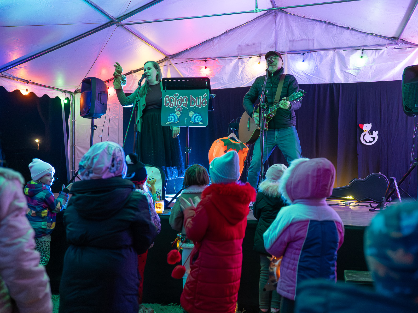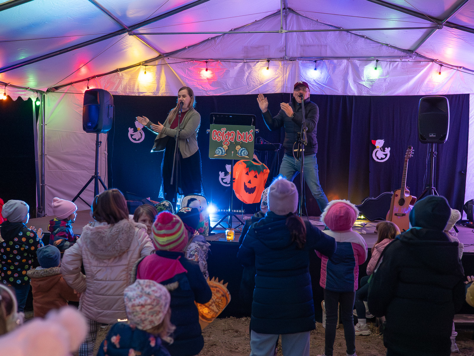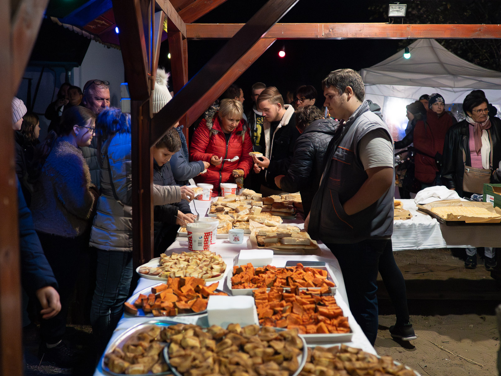 A Tájháznál a Vöröskereszt helyi önkéntesei már serényen tevékenykedtek a kemence körül: a vendégeket frissen sült kenyérlángos, illatozó sült alma és tök fogadta. A sátor alatti a színpad előtt az óvodások adtak kedves műsort, majd a gyerekek nagy örömére a Csiga Duo vette át a szórakoztatást.