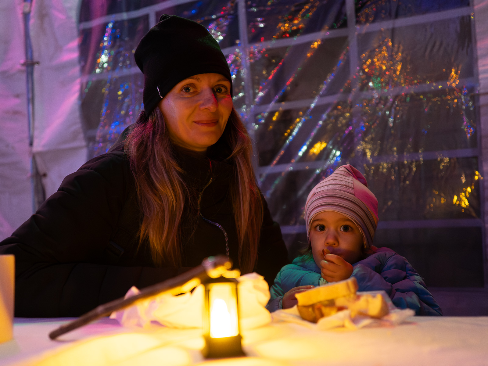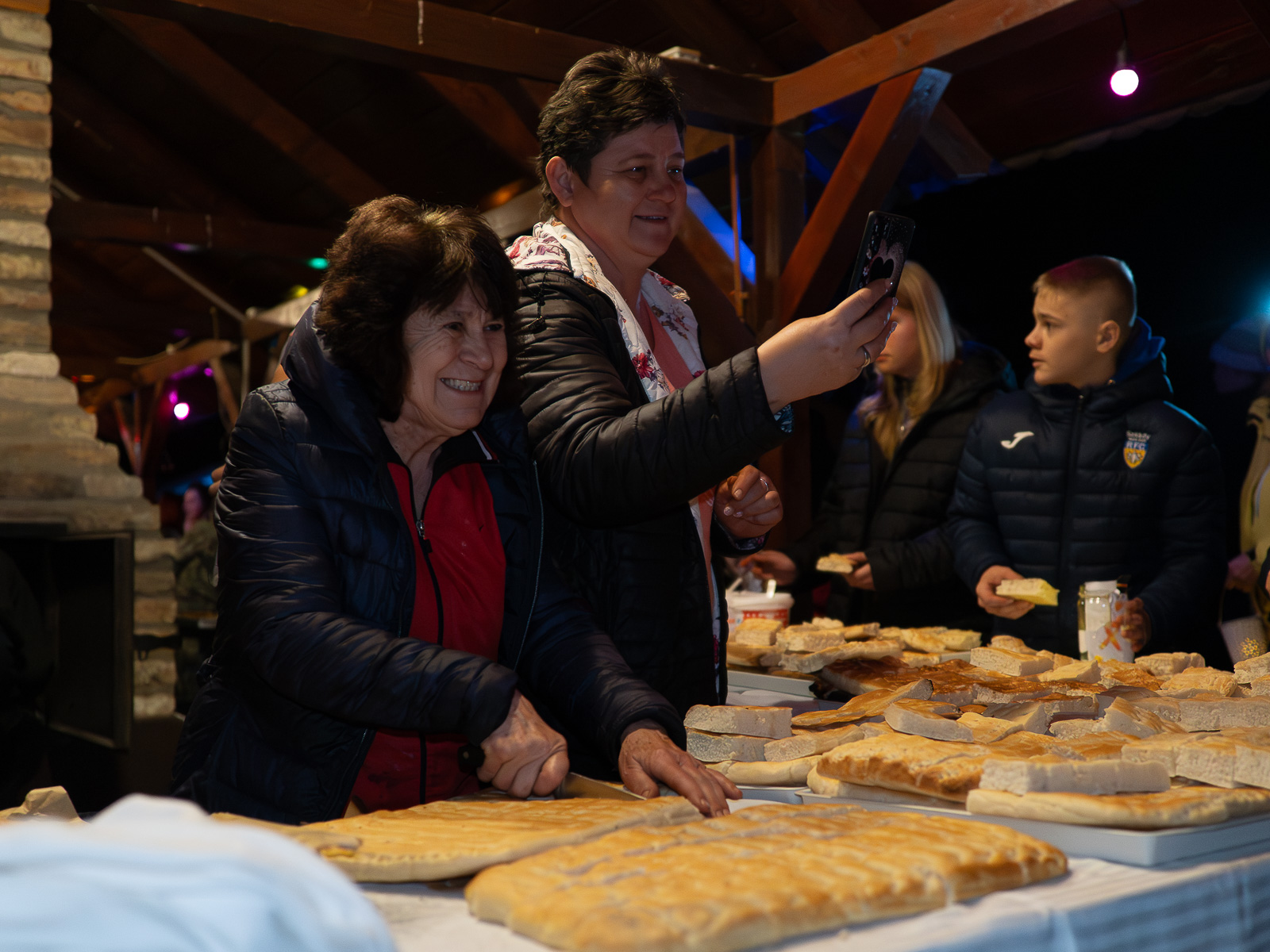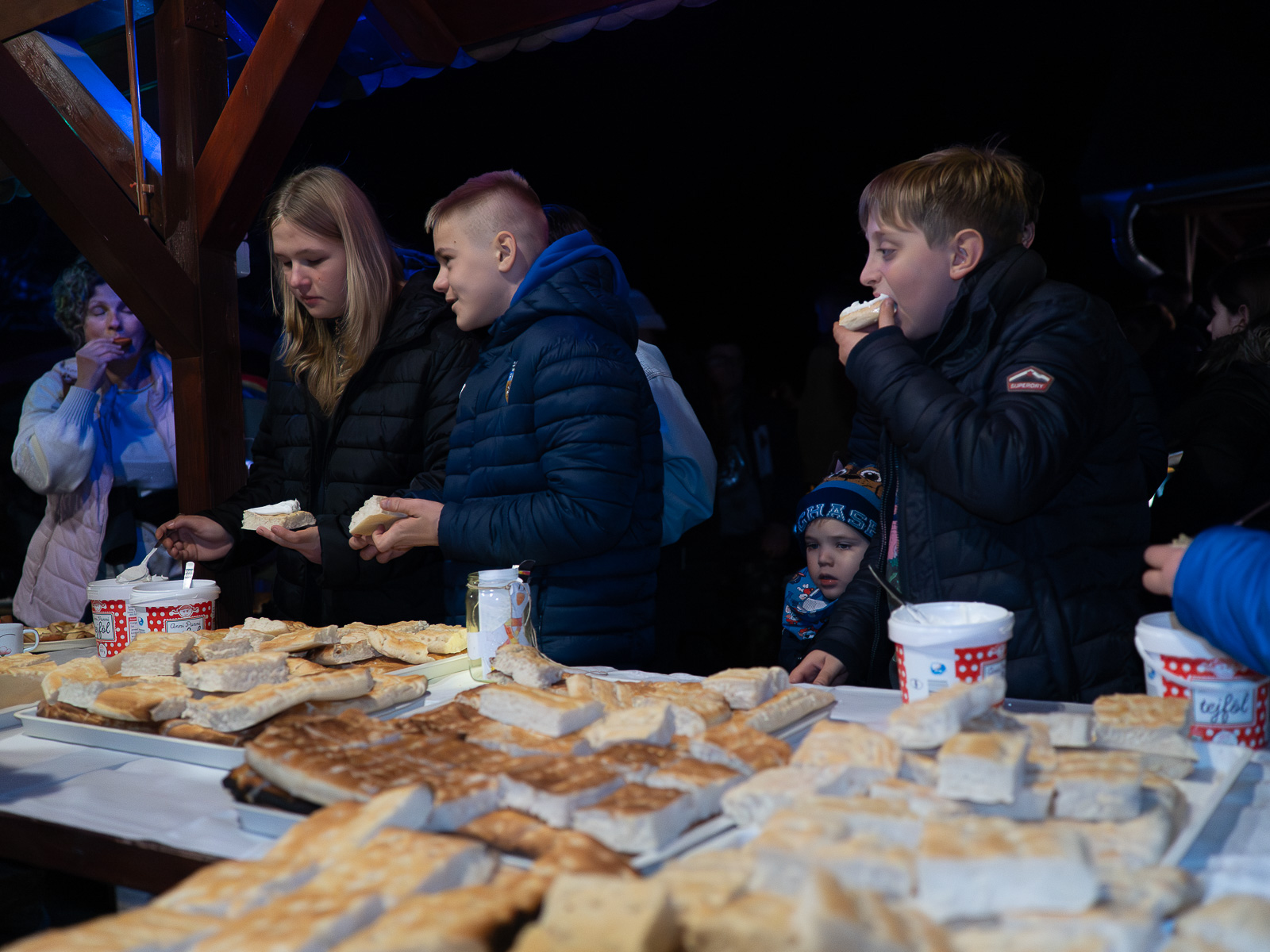 A Tájháznál a Vöröskereszt helyi önkéntesei már serényen tevékenykedtek a kemence körül: a vendégeket frissen sült kenyérlángos, illatozó sült alma és tök fogadta. A sátor alatti a színpad előtt az óvodások adtak kedves műsort, majd a gyerekek nagy örömére a Csiga Duo vette át a szórakoztatást.