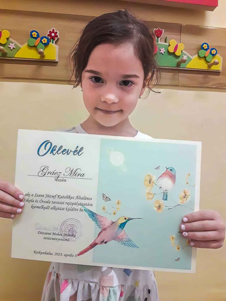 A kunfehértói Mosolyvár Óvoda két nagycsoportosa, Grácz Míra és Huszár Emma Róza is részt vett a kiskunhalasi Szent József Katolikus Általános Iskola által szervezett rajzpályázaton. A lányok kiváló munkáit oklevéllel díjazták. A pályamunkákból a Szent József Általános Iskola – a nemrégiben megnyitott kiállító termében – kiállítást rendezett, amelyet az érdeklődők megtekinthetnek.