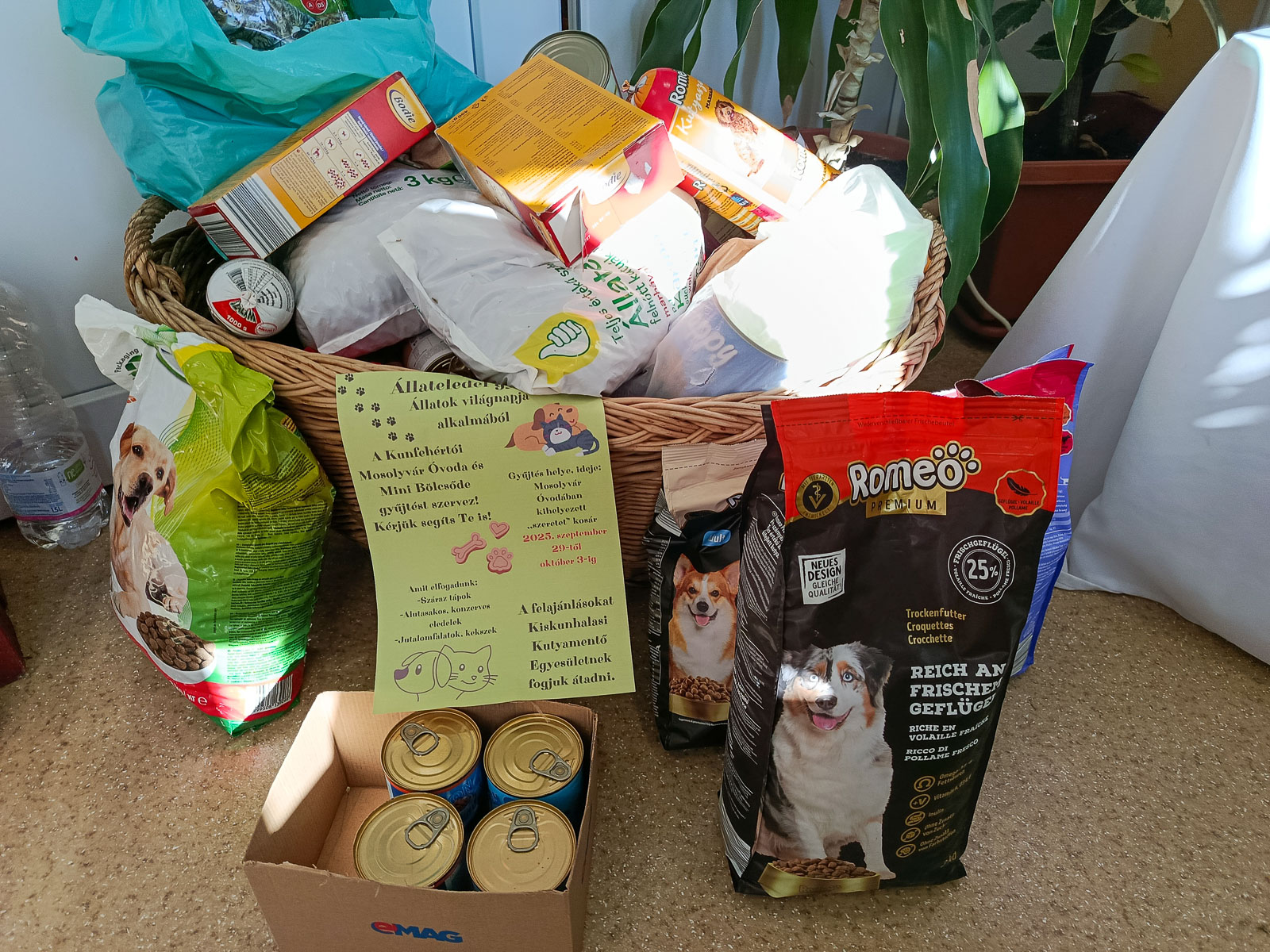 Az elmúlt hetekben meghirdetett állateledel-gyűjtő akció kiemelkedően sikeres volt: a gyerekek, szülők és az intézmény dolgozói közösen gyűjtöttek eleséget a rászoruló állatok számára. A felajánlások között számos kutya- és macskaeledel, jutalomfalat gyűlt össze, melyeket a Kiskunhalasi Kutyamentő Egyesületnek juttatnak el.