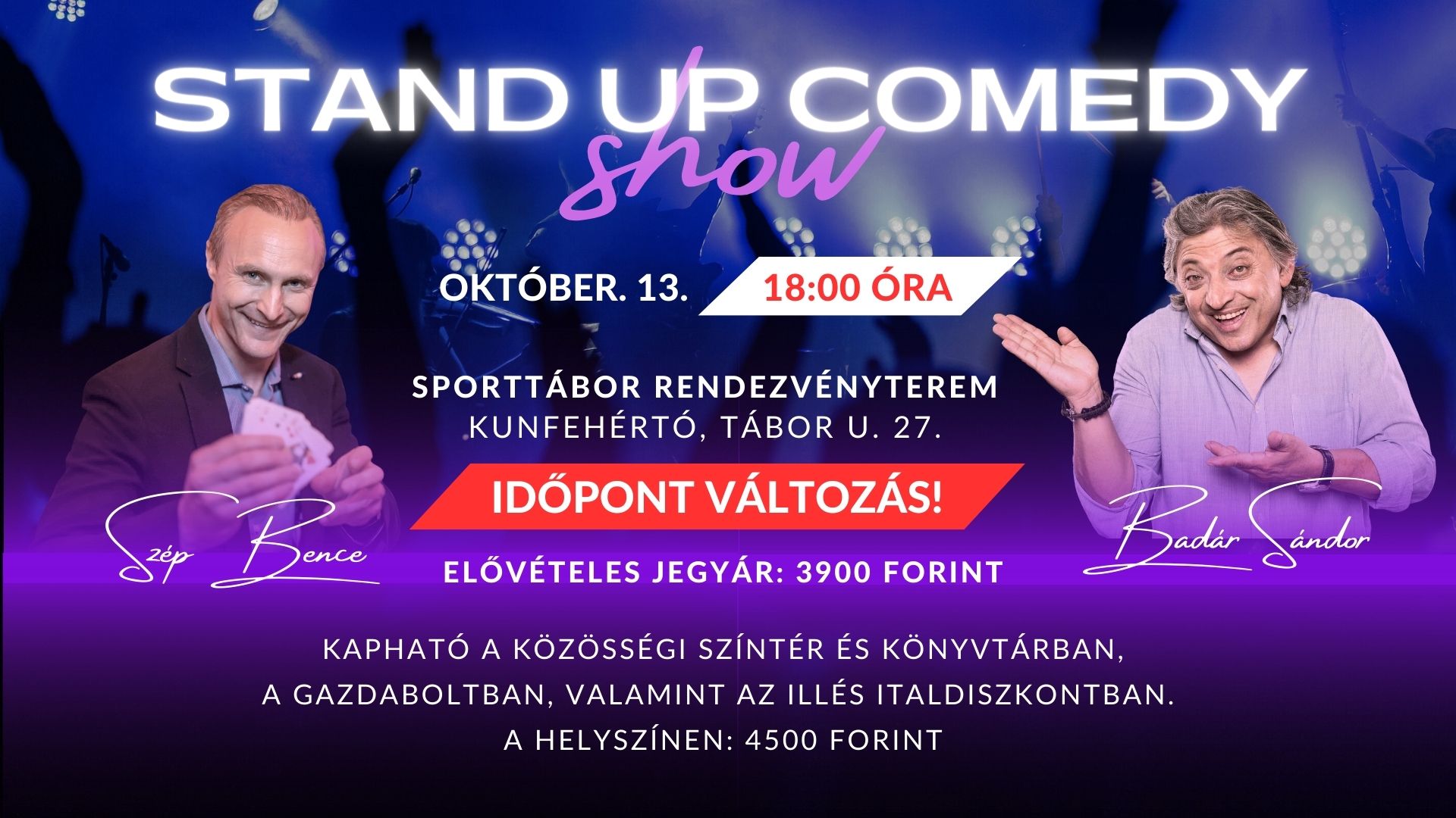 Stand Up Comedy estet rendeznek pénteken 18 órától Kunfehértón, a Sporttábor Rendezvénytermében (Kunfehértó, Tábor u. 27.), ahol Badár Sándor és Szép Bence fogja szórakoztatni a publikumot.